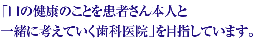 松岡歯科医院では、病気を治療するより、病気を予防することを柱にして診療を行っています。ひとくちに予防といっても、歯科で扱うむし歯も歯周病も生活習慣病のひとつですから、松岡歯科医院に来てくださった患者さんの生活を知らなければ十分な予防はできません。今までの治療の体験、生活の様子、好きな食べもの、家族構成などなど、かかりつけ医として十分なコミュニケーションをとることを基本にして診療を行っています。「言いたいことが言える歯科医院」「尋ねたいことが尋ねられる歯科医院」「口の健康のことを患者さん本人と一緒に考えていく歯科医院」を目指しています。